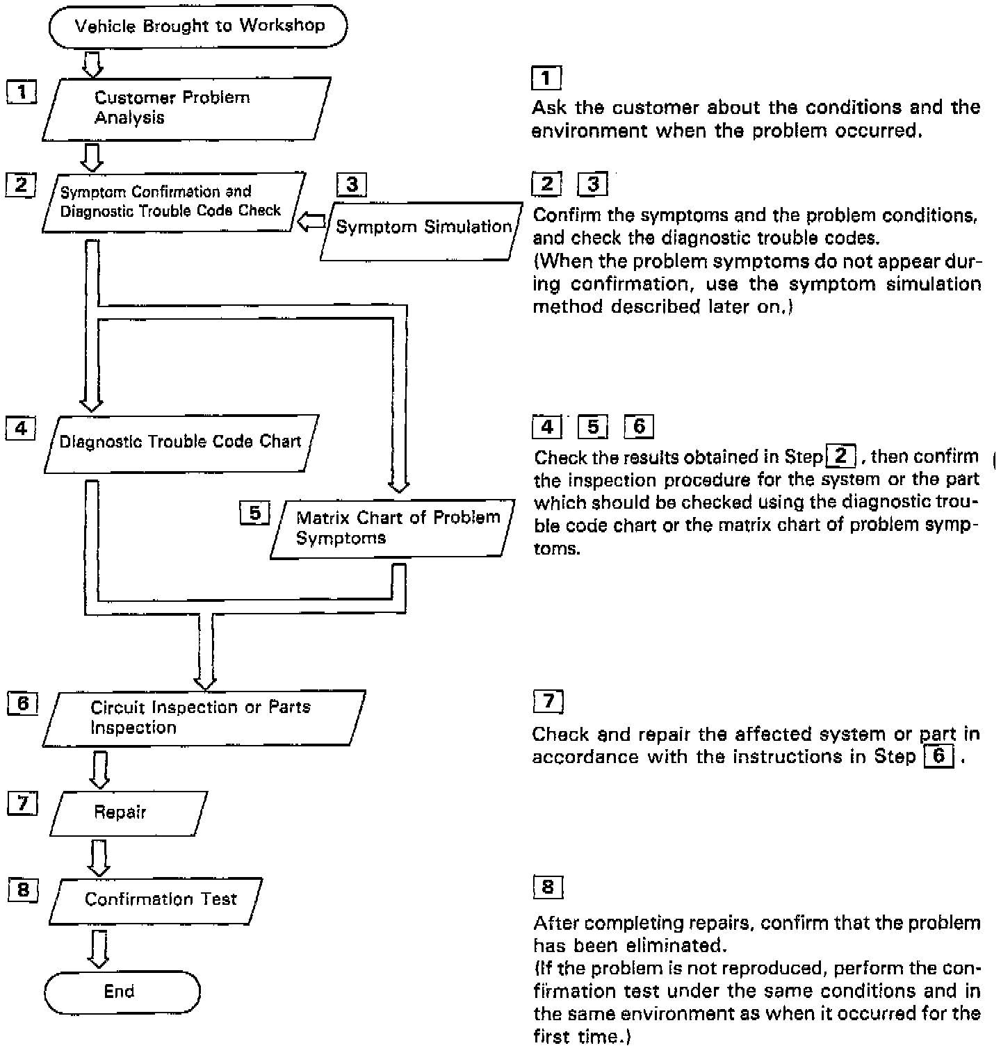 Carry out troubleshooting in accordance with the procedures outlined under this heading. Here, only the basic procedure is shown. Details are provided under each component or system, showing the most effective methods for each circuit. Confirm the troubleshooting procedures first for the relevant circuit before beginning troubleshooting of that circuit.