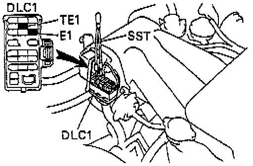 - Using a jumper wire (or SST 09843-18020), connect terminals TE1 and E1 of the DLC1.