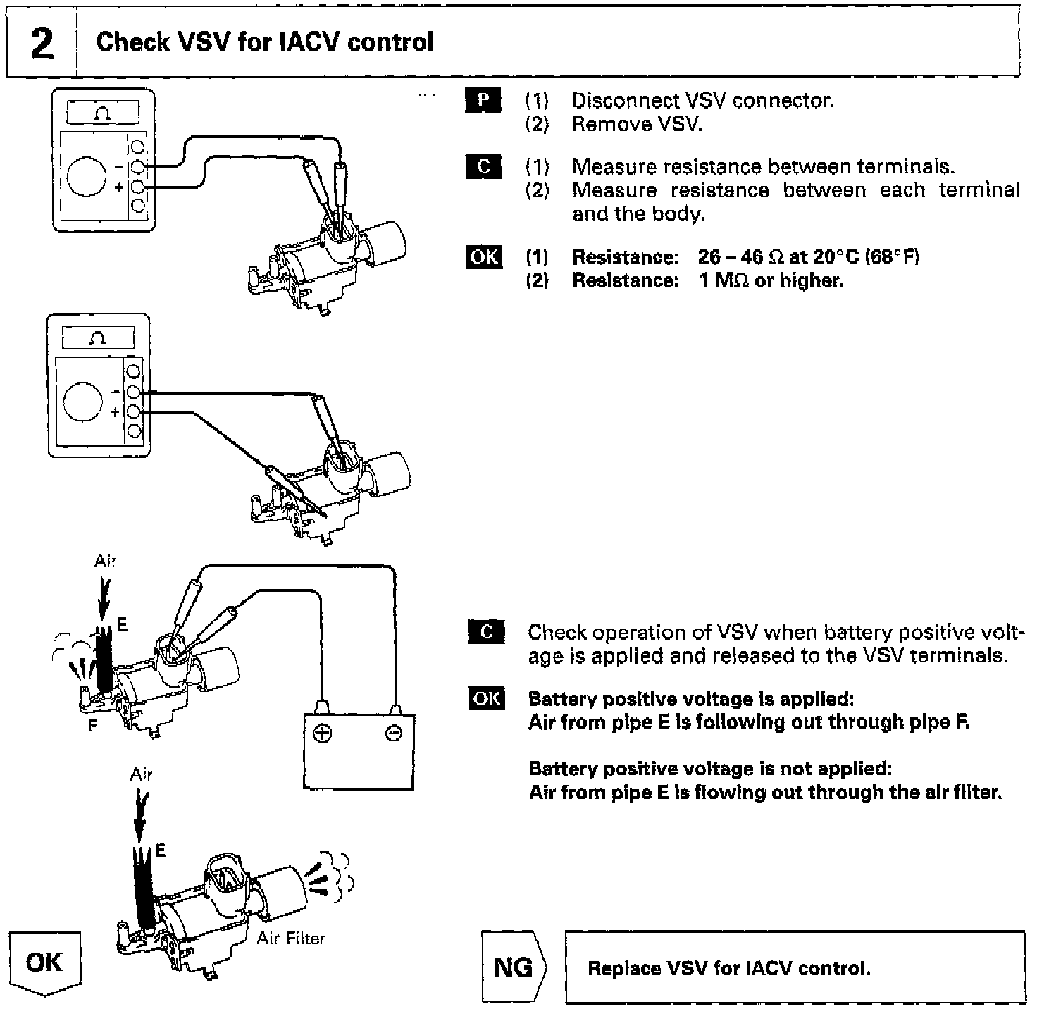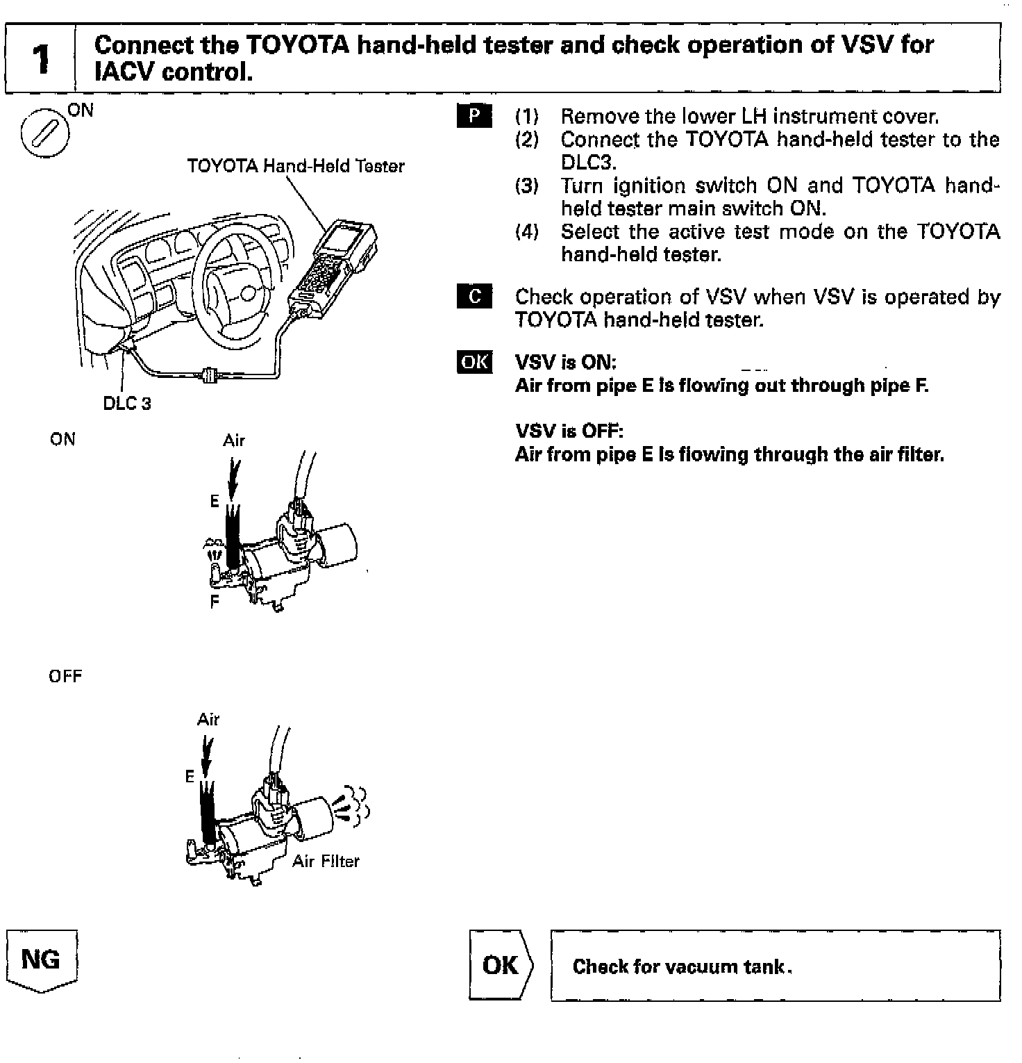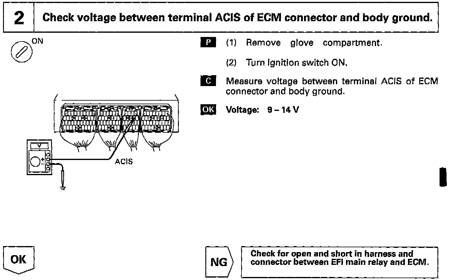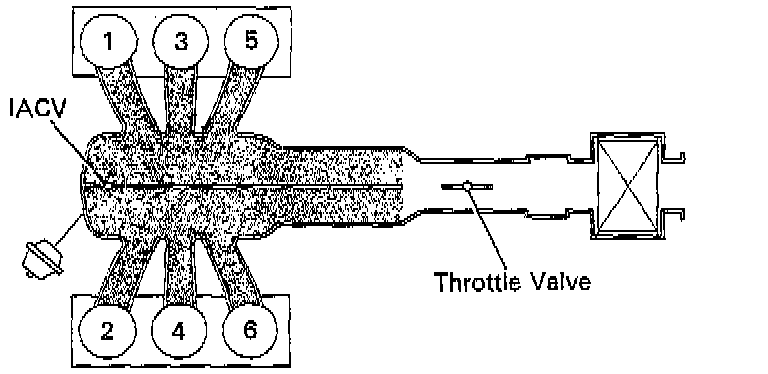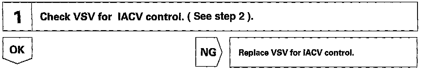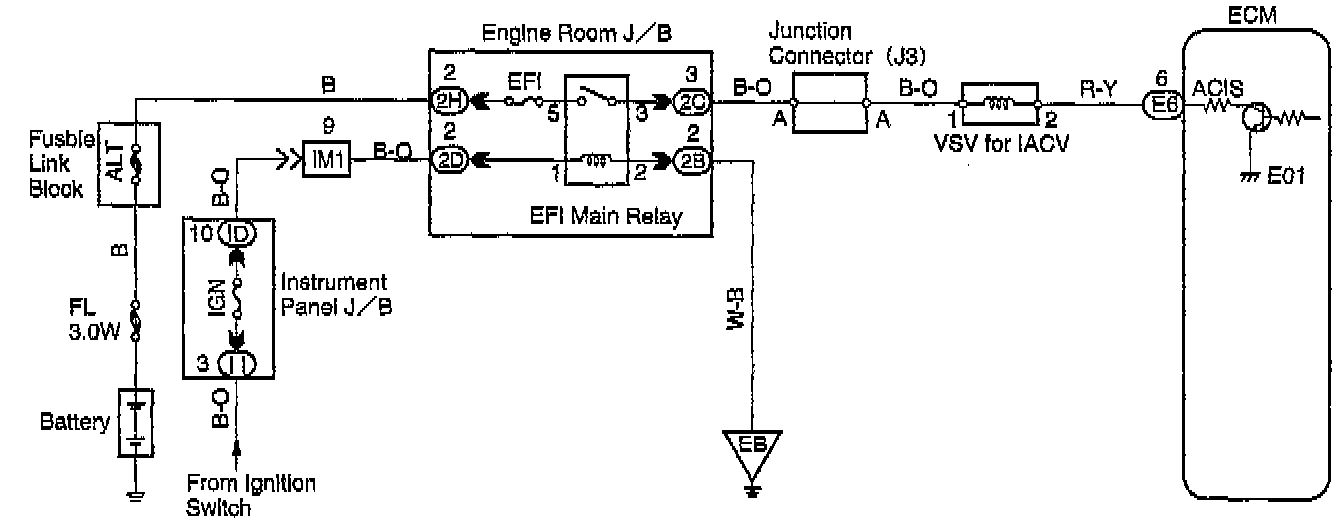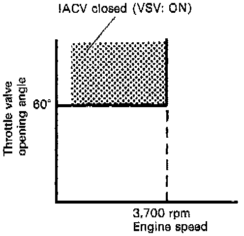 This circuit opens and closes the Intake Air Control Valve (IACV) in response to the engine load in order to increase the intake efficiency (ACIS: Acoustic Control Induction System). When the engine speed is 3,700 rpm or less and the throttle valve opening angle is 60° or more, the ECM turns the vacuum switching valve (VSV) ON and closes the IACV. At all other times, the VSV is OFF, so the IACV is open.