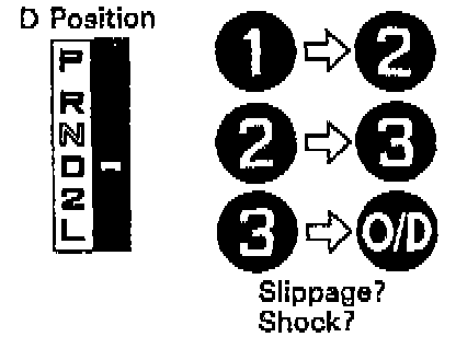 - While running in the D position, 2nd, 3rd and 0/D gears, check to see that the possible kick-down vehicle speed limits for 2 -> l, 3 -> 2 and O/D -> 3 kick-downs conform to those indicated on the automatic shift schedule.