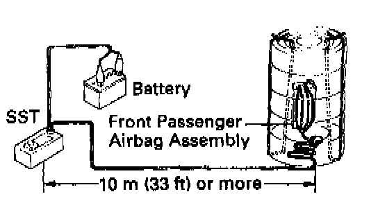 - When deploying an airbag, perform the operation from at least 10m (33 ft) away from the front passenger airbag assembly.