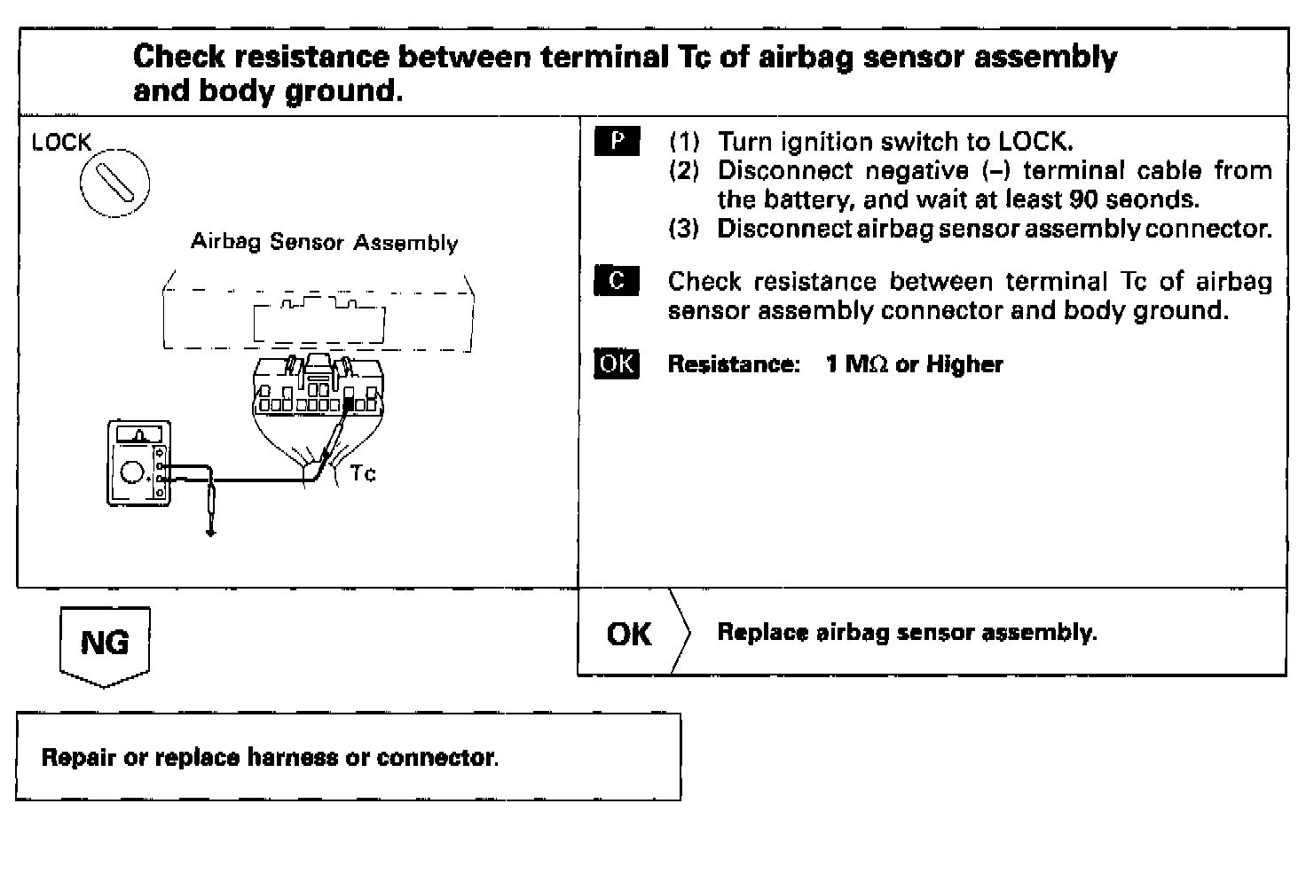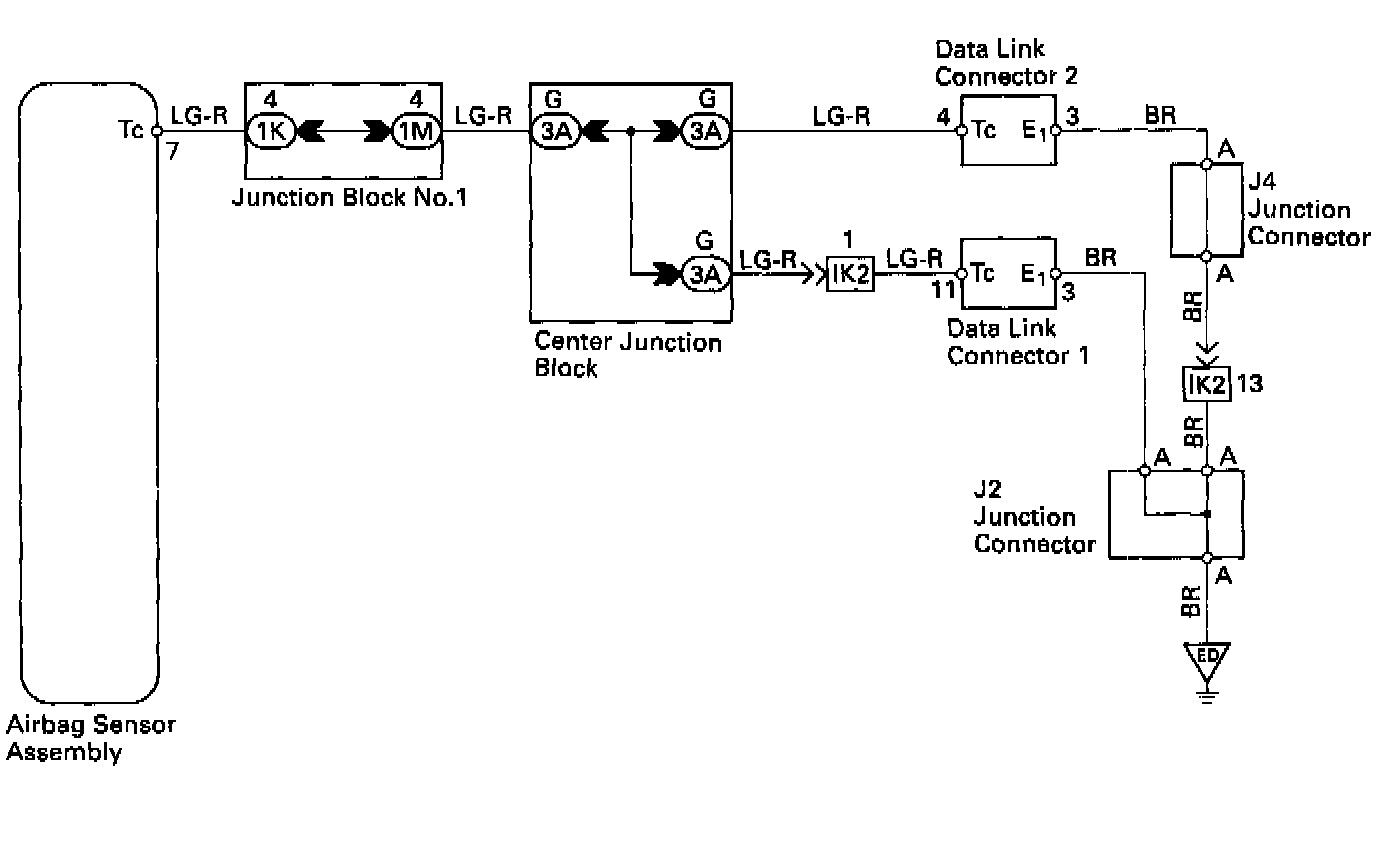 By connecting terminals Tc and E1 of the DLC1 or DLC2 the airbag sensor assembly is set in the diagnostic trouble code output mode. The diagnostic trouble codes are displayed by the blinking of the SRS warning light.