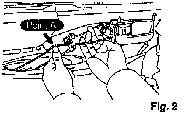 3. Support the link rod by positioning the fingers of your right hand behind the link rod just forward of the bell crank clip to act like spacers. Then push outboard at the bend in the link rod (point A) to straighten the rod with your other hand (Fig. 2).