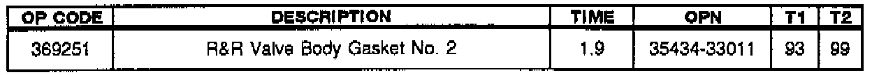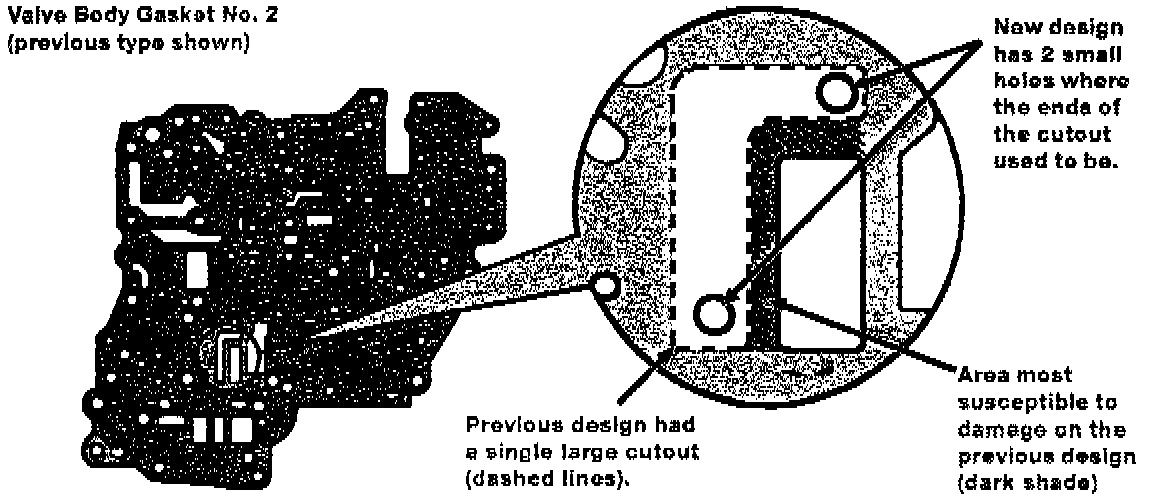 To improve durability, the shape of Valve Body Gasket No.2 has been changed. Should a vehicle exhibit harsh engagement shock when shifting from "N" --> "R" or "P" --> "R" inspect condition of this gasket. If gasket is found to be damaged as shown in the illustration, also inspect the Direct Clutch (02) for damage.