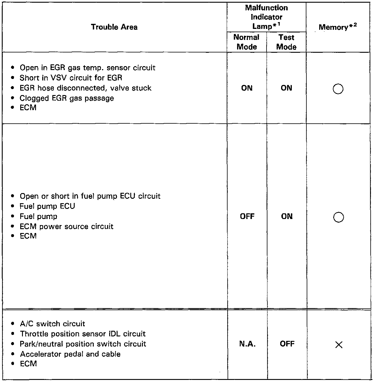 *2: "0" in the memory column indicates that a diagnostic trouble code is recorded in the ECM memory when a malfunction occurs. "x" indicates that a diagnostic trouble code is not recorded in the ECM memory even if a malfunction occurs. Accordingly, output of diagnostic results in normal or test mode is done with the IG switch ON.