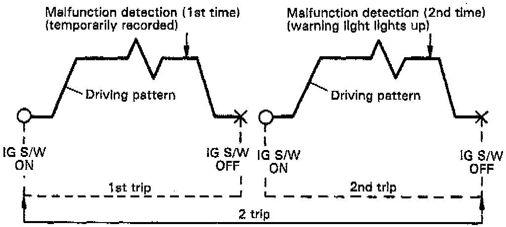 *3: This indicates items for which "2 trip detection logic" is used. With this logic, when a logic malfunction is first detected, the malfunction is temporarily stored in the ECM memory. If the same case is detected again during the second drive test, this second detection causes the O/D OFF indicator light to blink. The 2 trip repeats the same mode twice. (However, the IG switch must be turned OFF between the 1st trip and 2nd trip.)