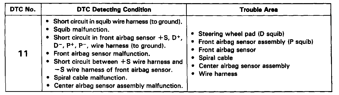 For details of the function of each component, see FUNCTION OF COMPONENTS. DTC 11 is recorded when ground short is detected in the squib circuit or front airbag sensor circuit.