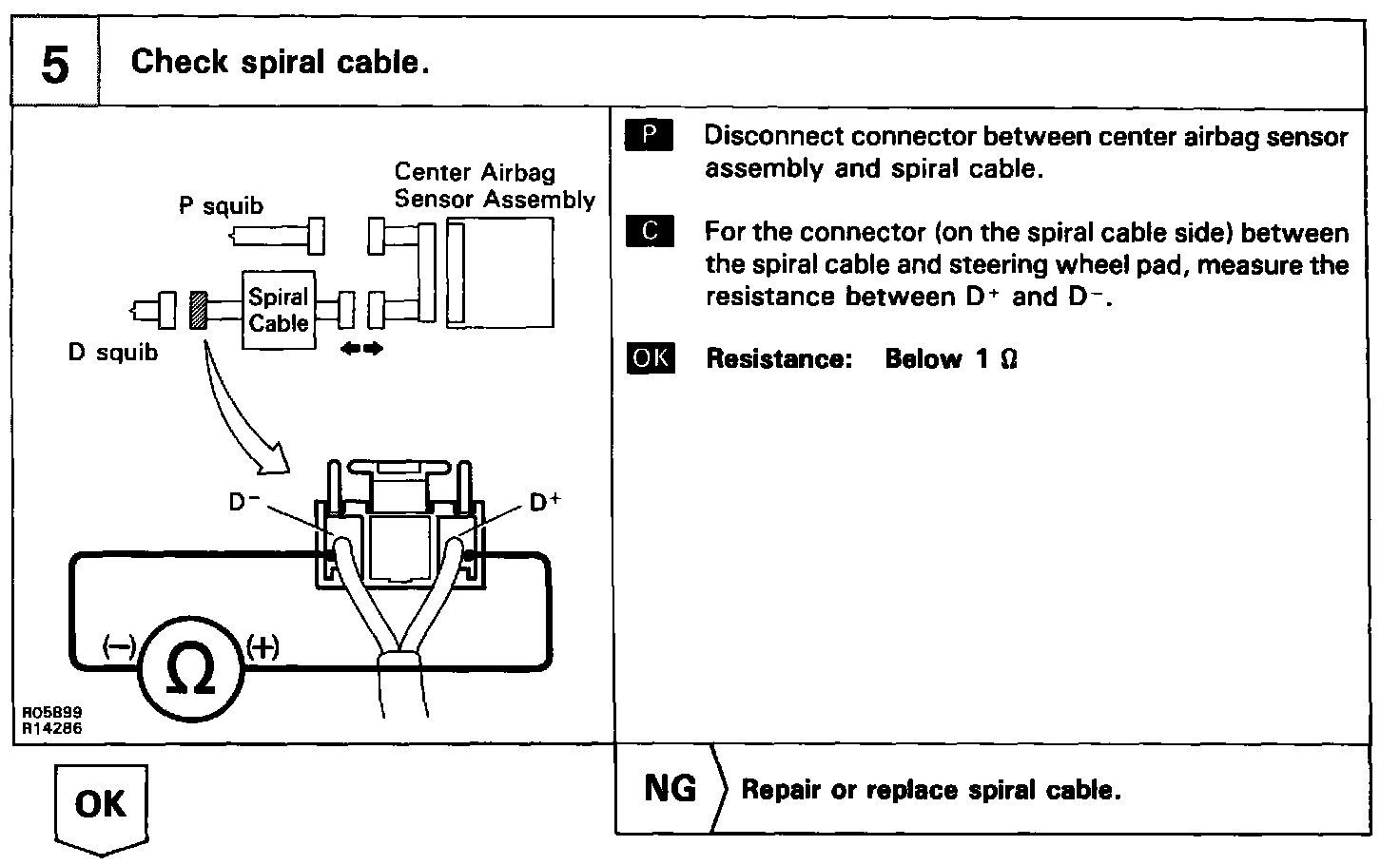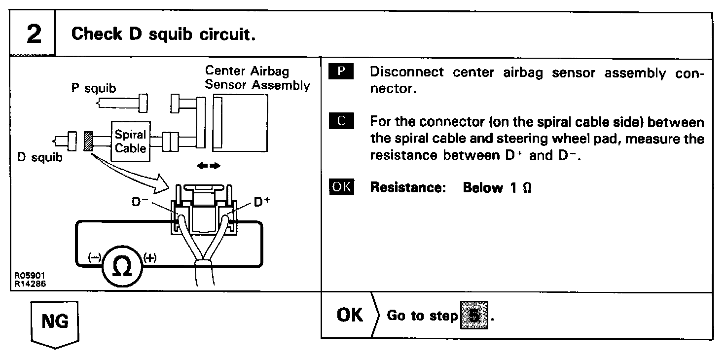 The squib circuit consists of the center airbag sensor assembly, spiral cable and the steering wheel pad. It causes the airbag to deploy when the airbag deployment conditions are satisfied.