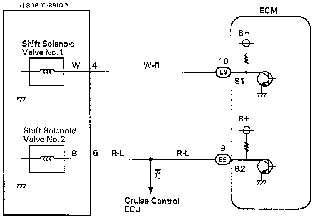 Shifting from 1st to O/D is done in combination with ON and OFF of the shift solenoid valves No.1 and No.2 controlled by ECM. If an open or short circuit occurs in either of the solenoid valves, the ECM controls the remaining normal solenoid to allow the vehicle to be operated smoothly (Fail safe function).