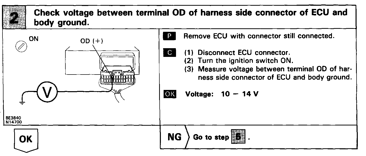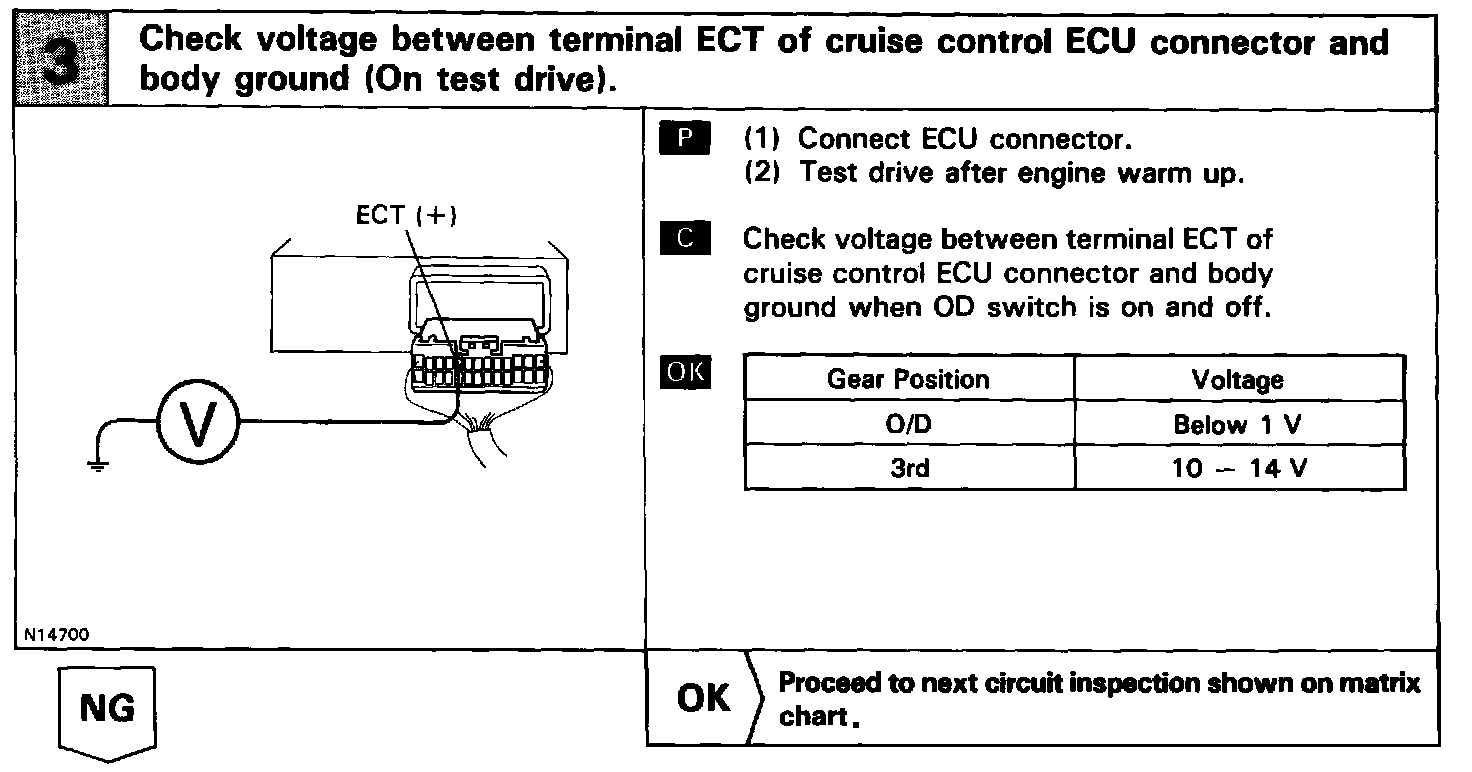 Terminal ECM of the cruise control ECU detects the shift change signal (output to electronically controlled transmission No.2 solenoid) from the electronically controlled transmission.