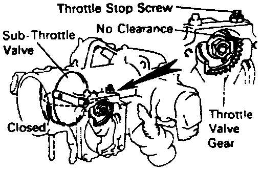 - Check that there is no clearance between the throttle stop screw and throttle valve gear when the sub-throttle valve is fully closed.