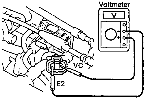 (c) Using a voltmeter, measure the voltage between connector terminals VC and E2 of the wiring harness side.