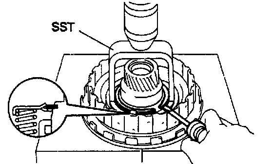 b) Place SST on the spring retainer, and compress the return spring with a shop press.