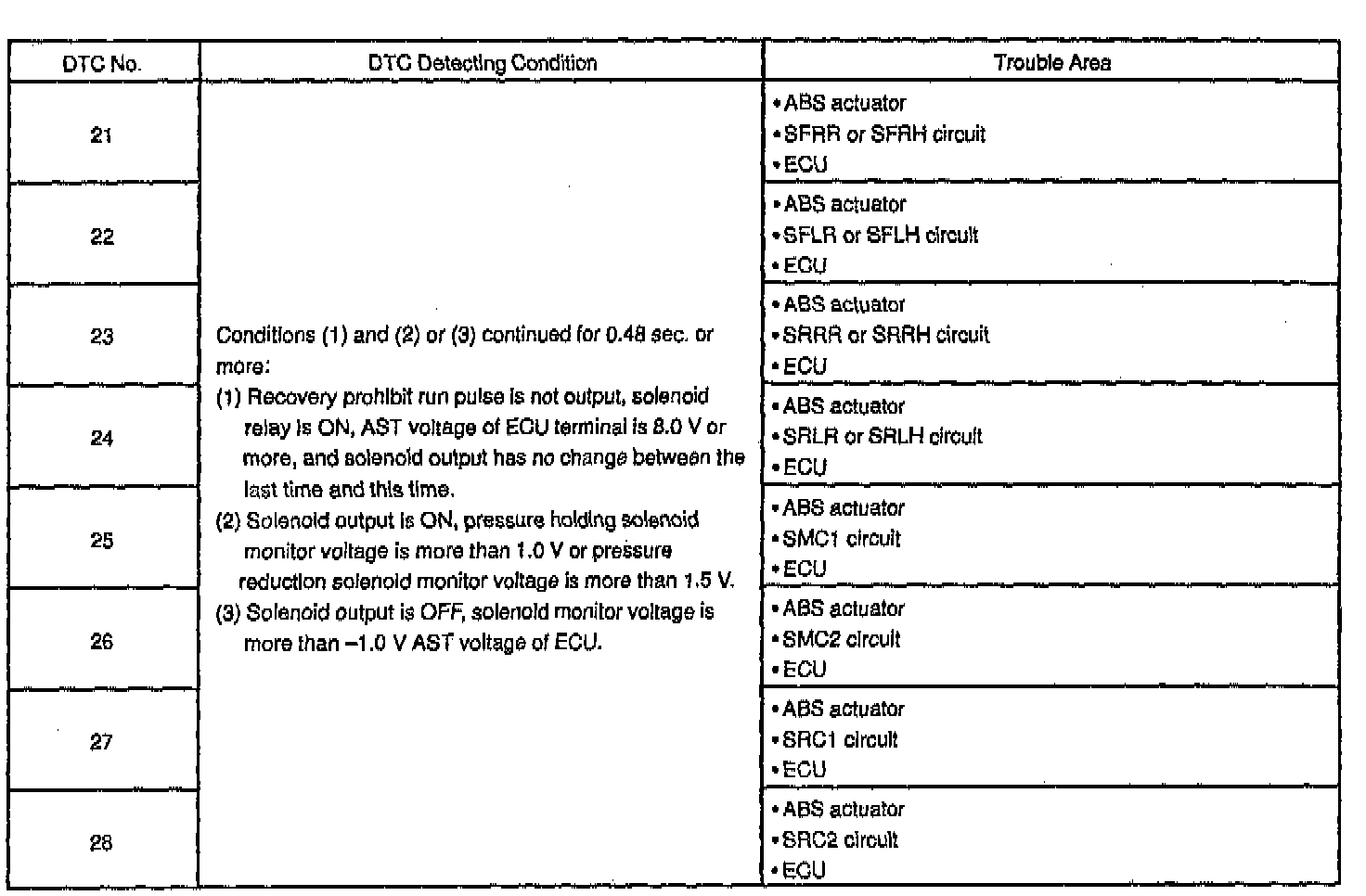 If trouble occurs in the Actuator Solenoid circuit, the ECU cuts off current to the ABS & TRAC Solenoid Relay and prohibits ABS control and TRAC control.