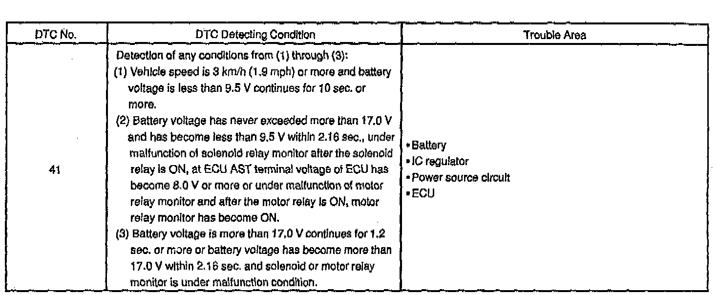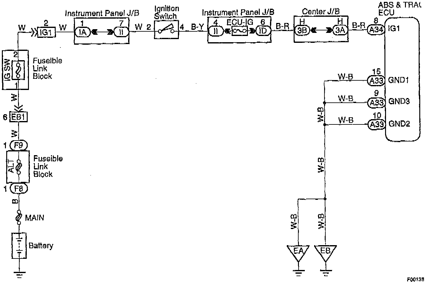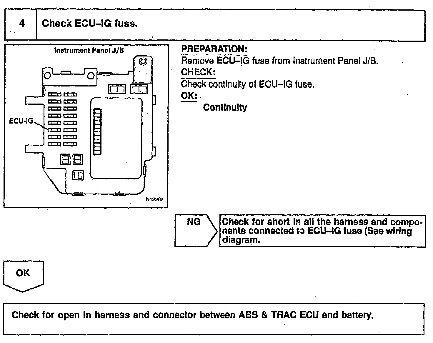 If trouble occurs in the power source circuit, the ECU cuts off current to the ABS & TRAC Solenoid Relay and prohibits ABS control and TRAC control.