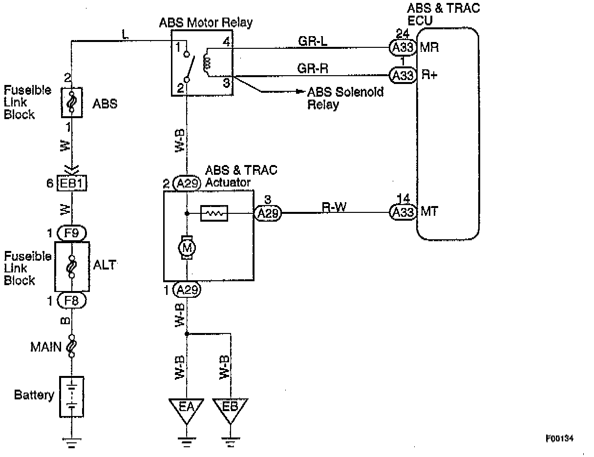 If trouble occurs in the ABS & TRAC Pump Motor, the ECU cuts off current to the ABS & TRAC Solenoid Relay and prohibits ABS control and TRAC control.