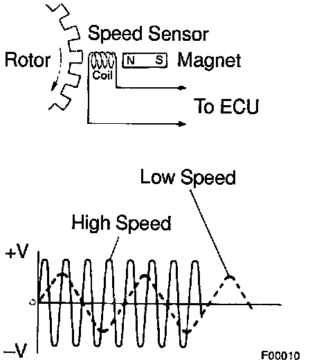 When the Rotors rotate, the magnetic field emitted by the permanent magnet in the Speed Sensor generates an AC voltage. Since the frequency of this AC voltage changes in direct proportion to the speed of the Rotor, the frequency is used by the ECU to detect the speed of each wheel.