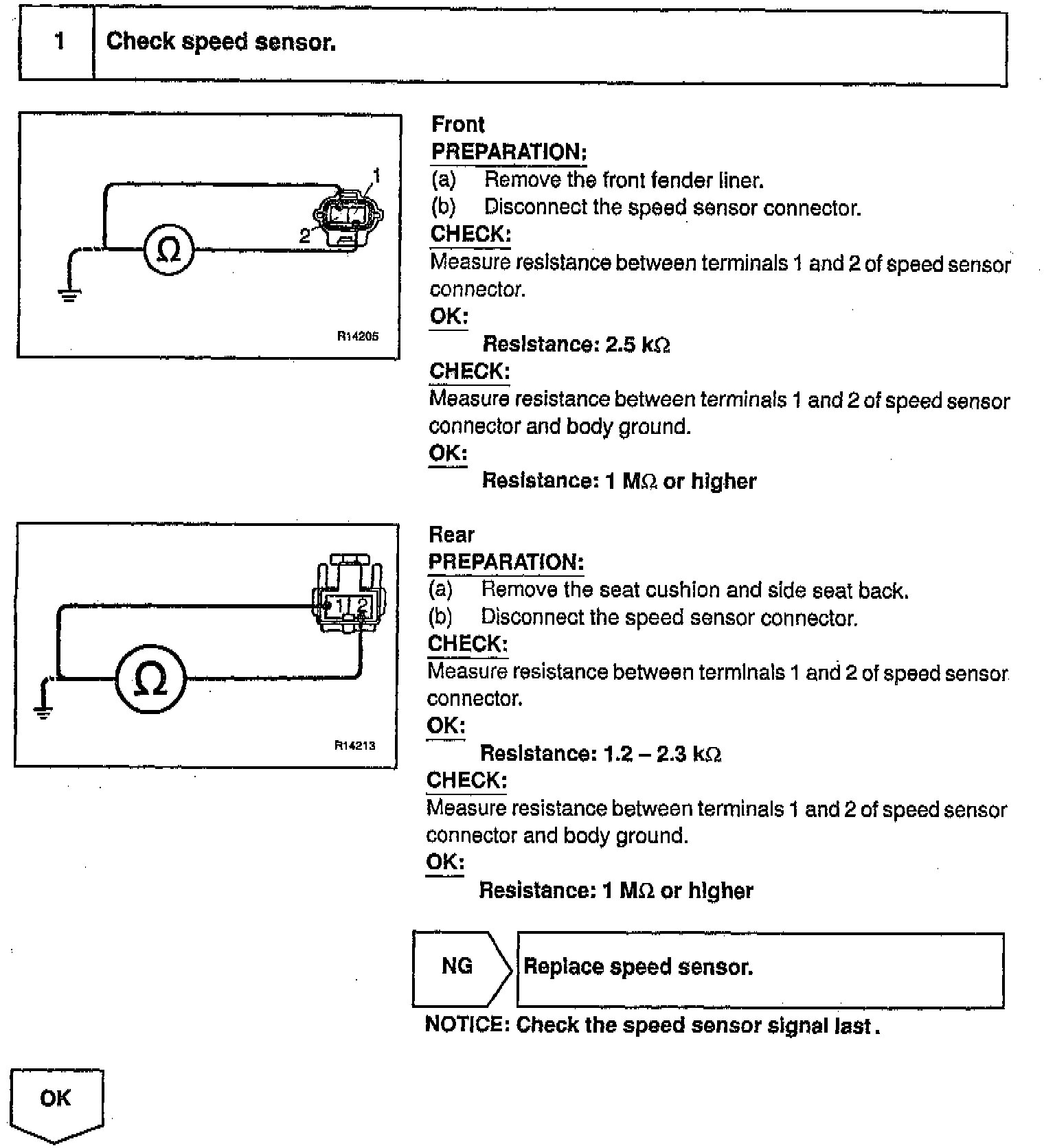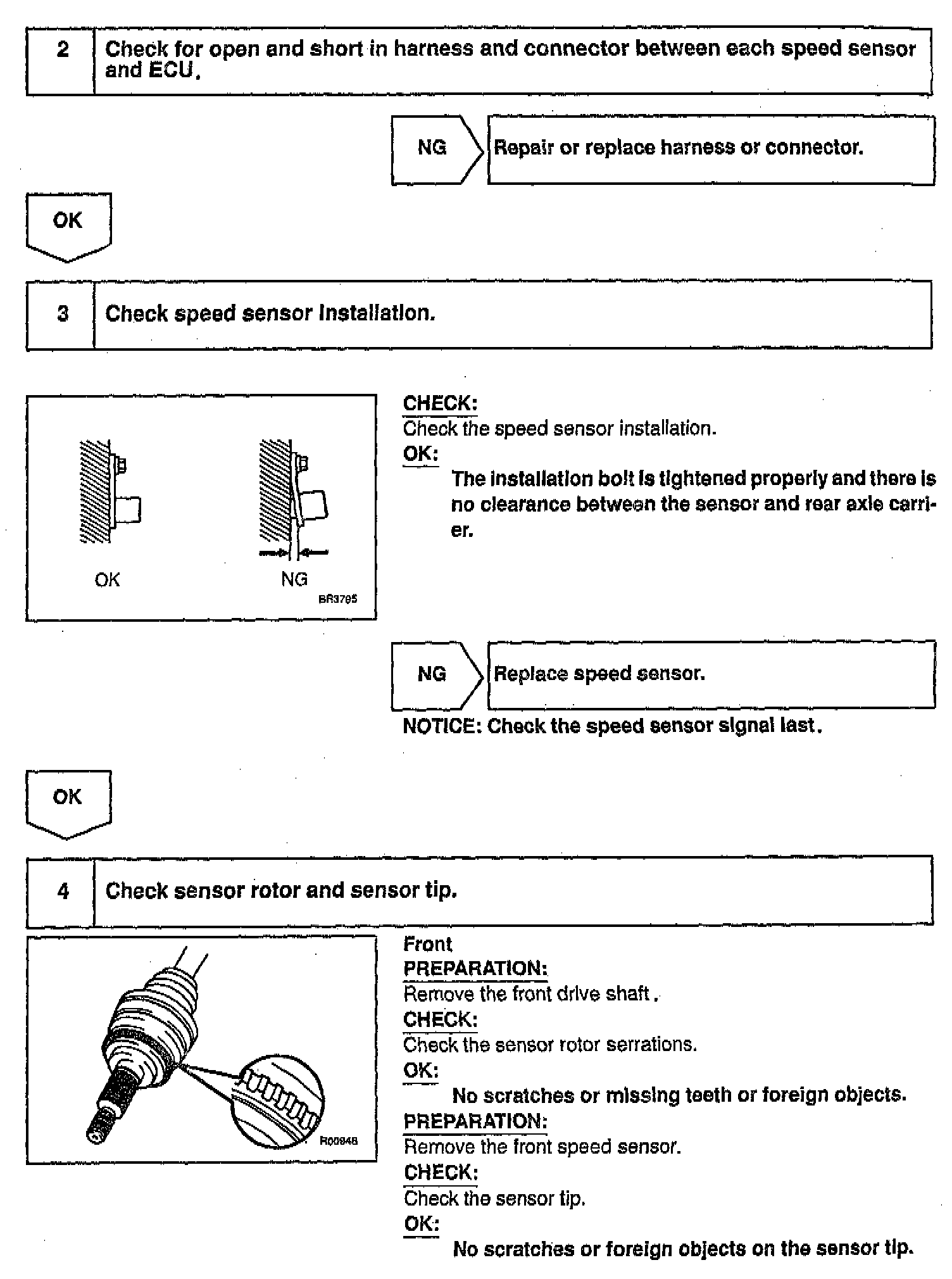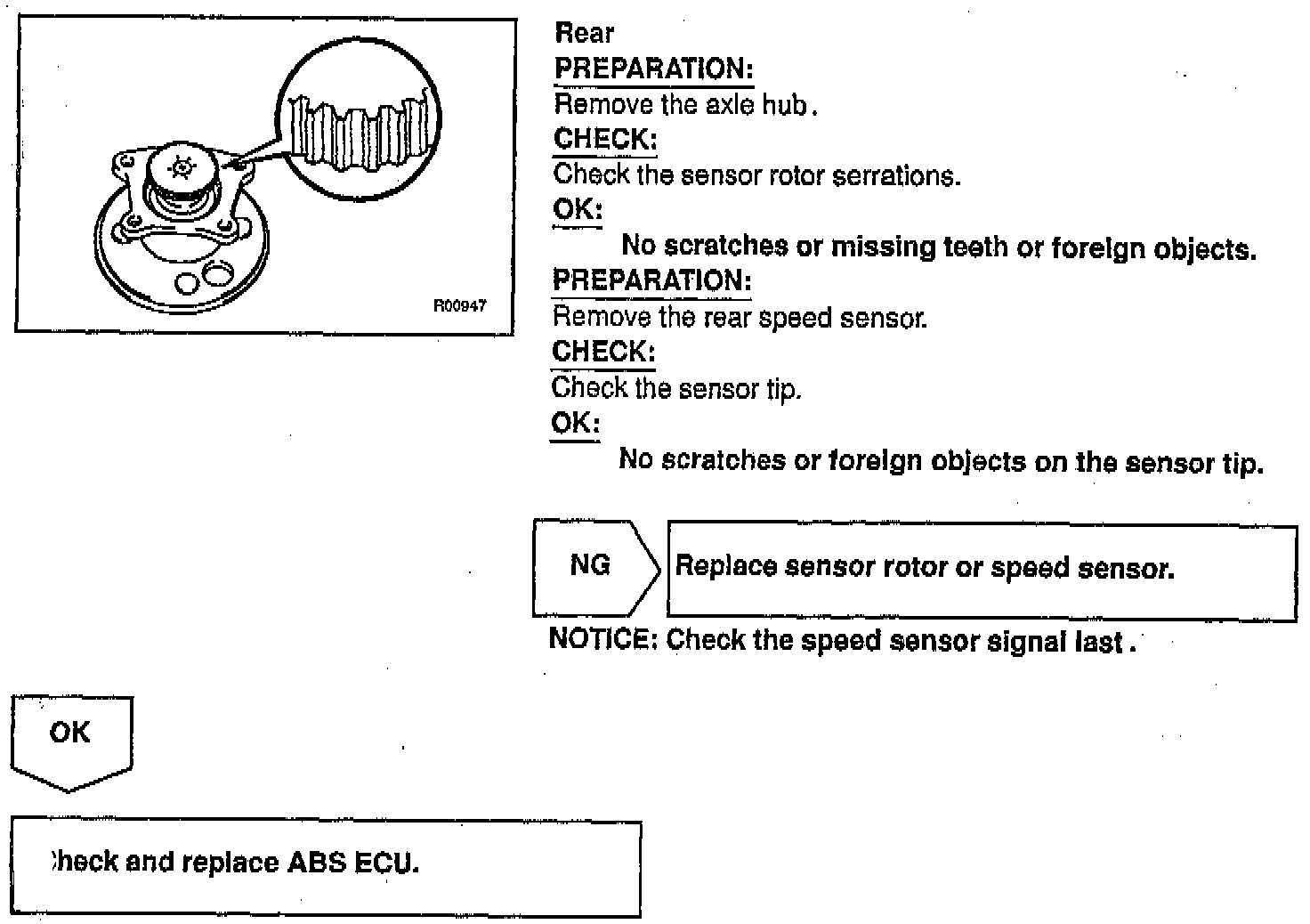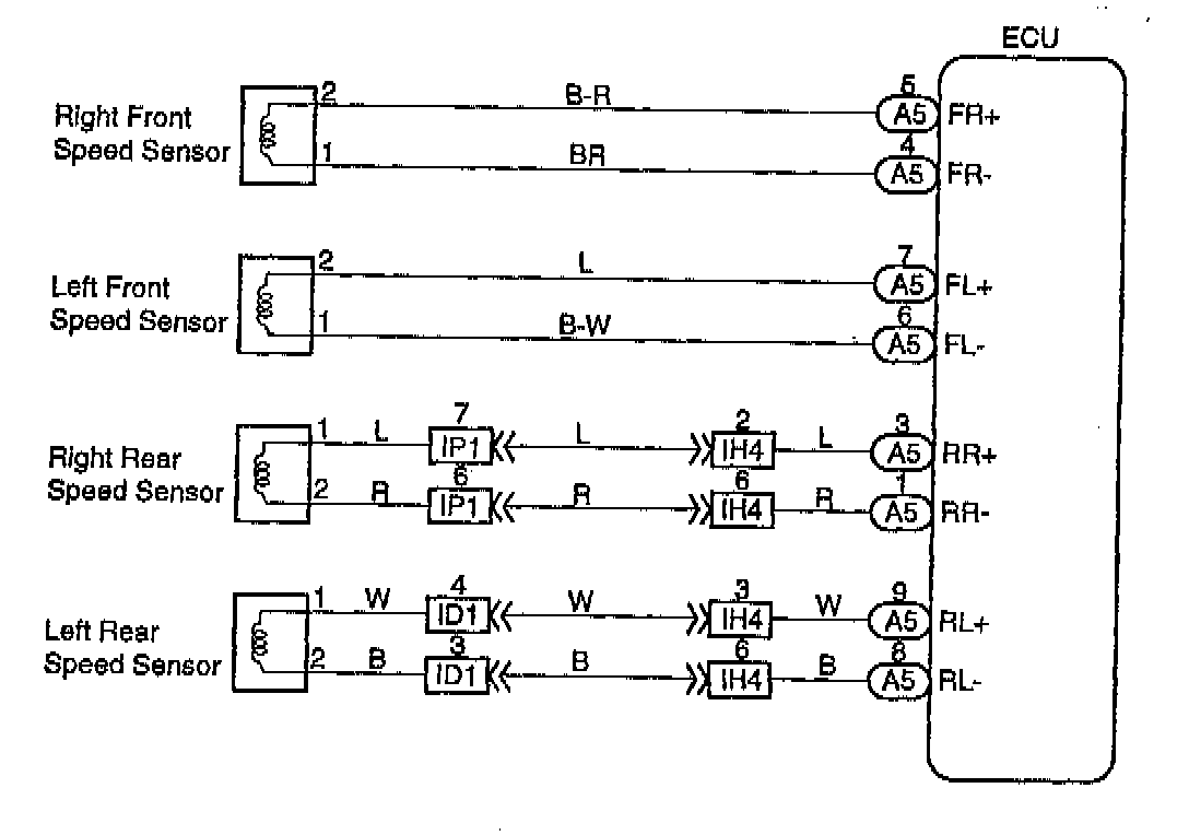 If trouble occurs in the speed sensor circuit, the ECU cuts off current to the ABS Solenoid Valve Relay and prohibits ABS control.