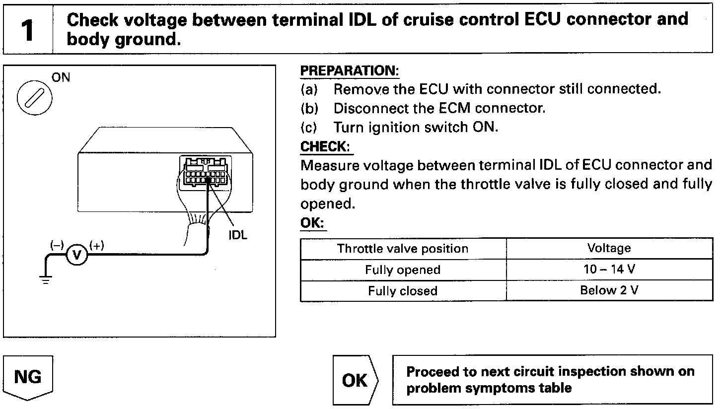When the idle switch in turned ON, a signal is sent to the ECU. The ECU uses this signal to correct the discrepancy between the throttle valve position and the actuator position sensor value to enable accurate cruise control at the set speed. if the idle switch is malfunctioning, problem symptoms also occur in the engine, so also inspect the engine.