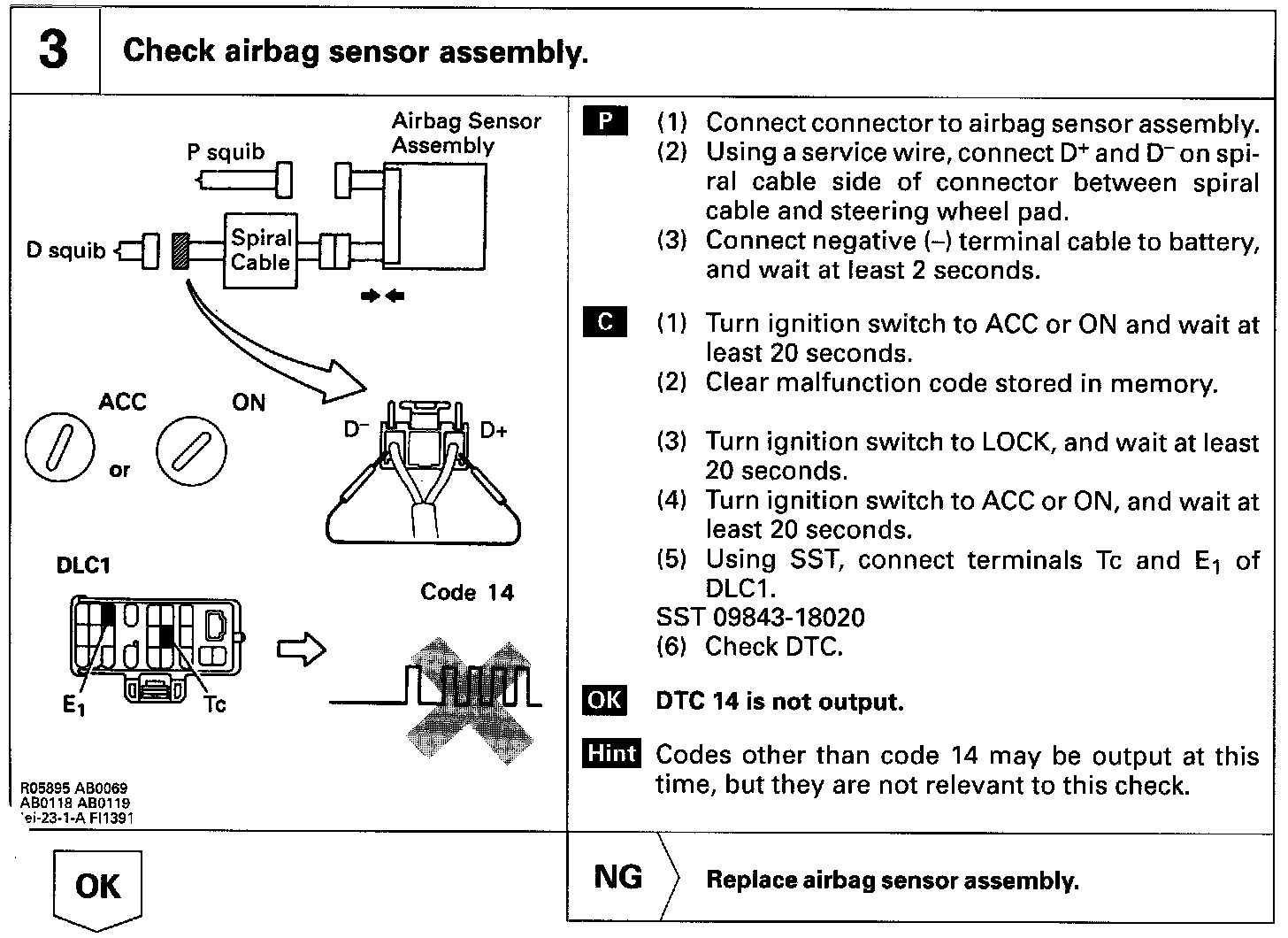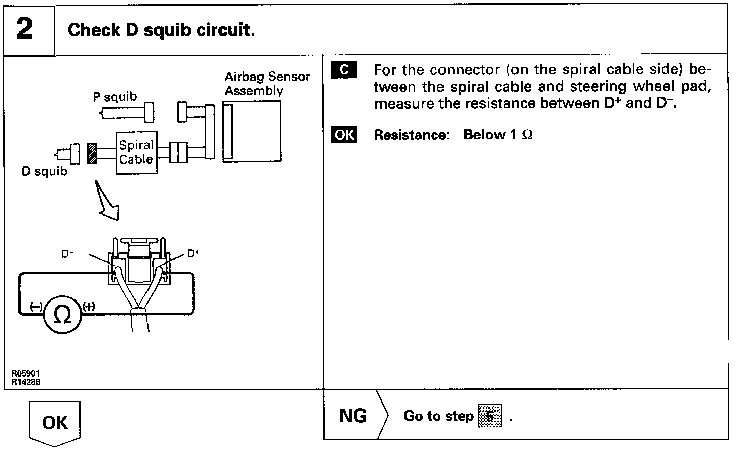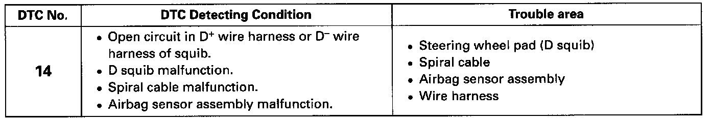 For details of the function of each component, see FUNCTION OF COMPONENTS. DTC 14 is recorded when an open is detected in the D squib circuit.