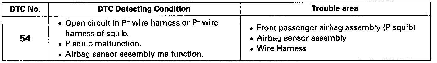 For details of the function of each component, see FUNCTION OF COMPONENTS. DTC 54 is recorded when an open is detected in the P squib circuit.