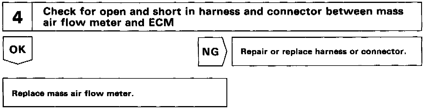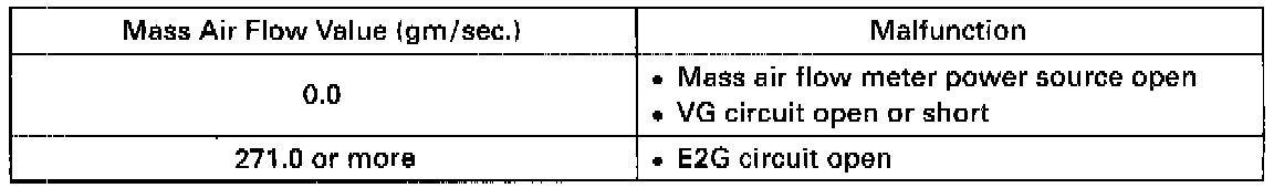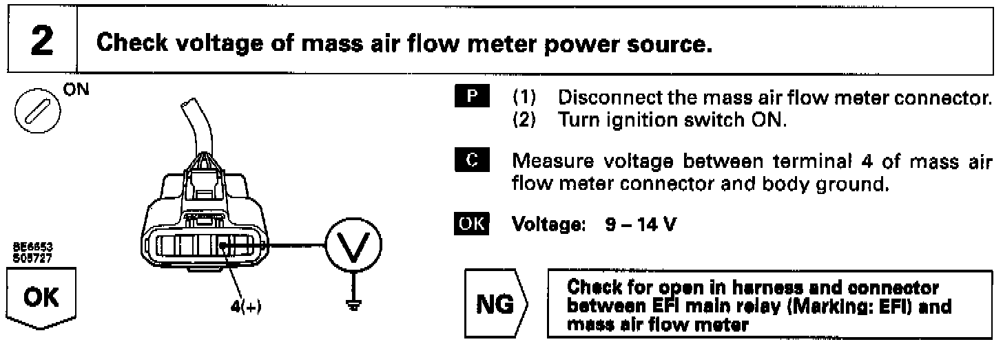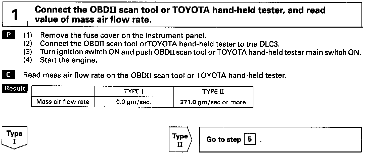 HINT: After confirming DTC P0100 use the OBDII scan tool or TOYOTA hand-held tester to confirm the mass air flow ratio from "CURRENT DATA".
