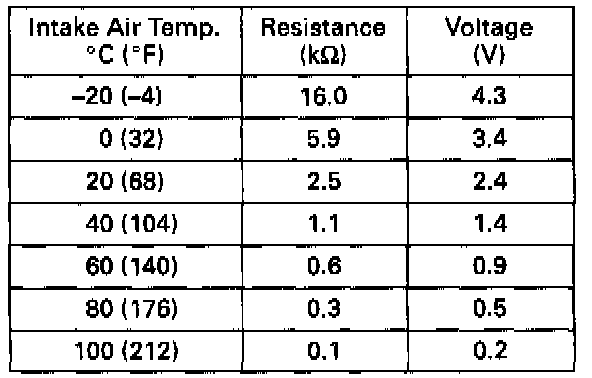The intake air temp. sensor is built into the air flow meter and senses the intake air temperature. A thermistor built in the sensor changes the resistance value according to the intake air temperature. The lower the intake air temperature,the greater the thermistor resistance value, and the higher the intake air temperature, the lower the thermistor resistance value (See Fig. 1.).
