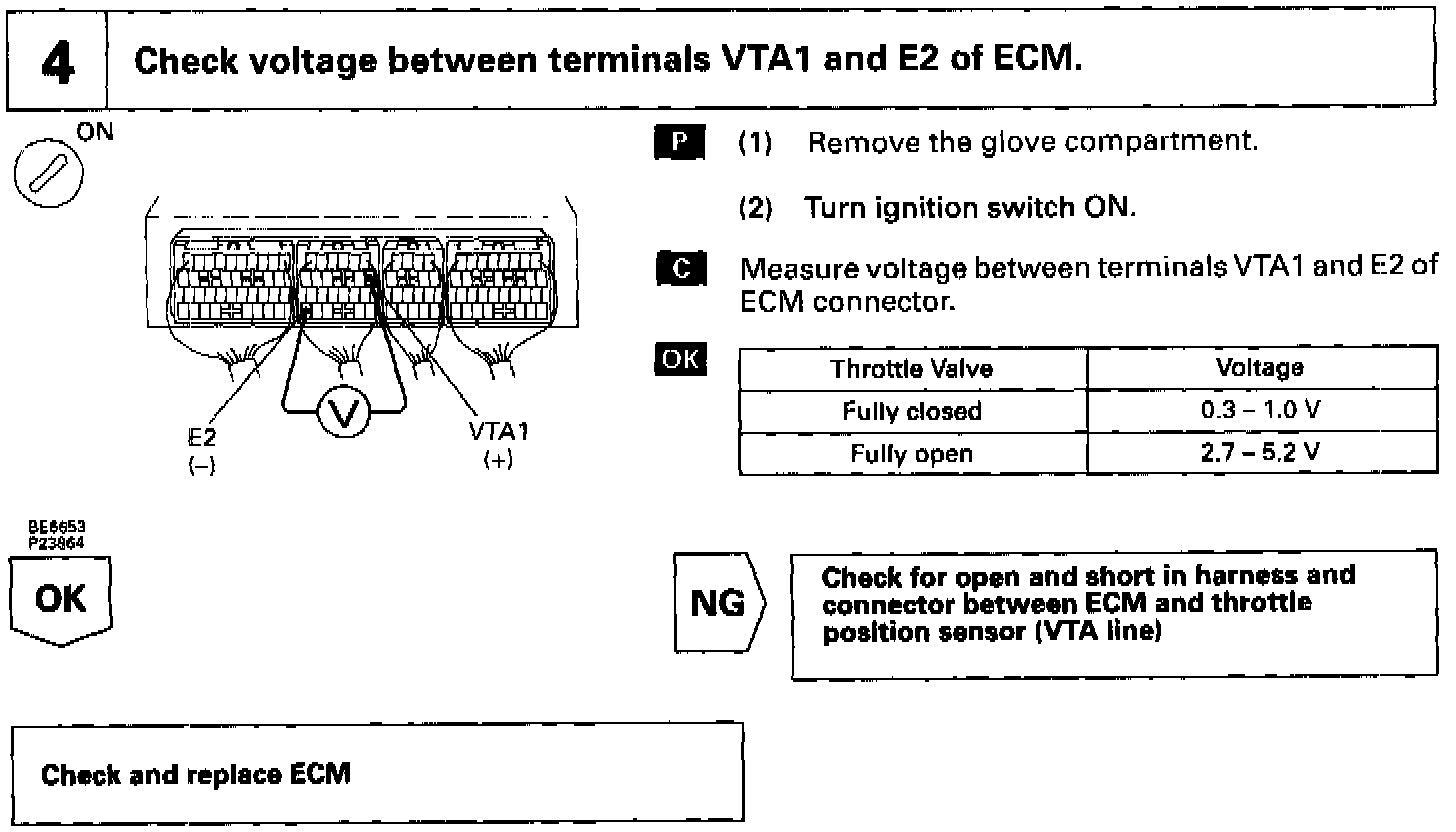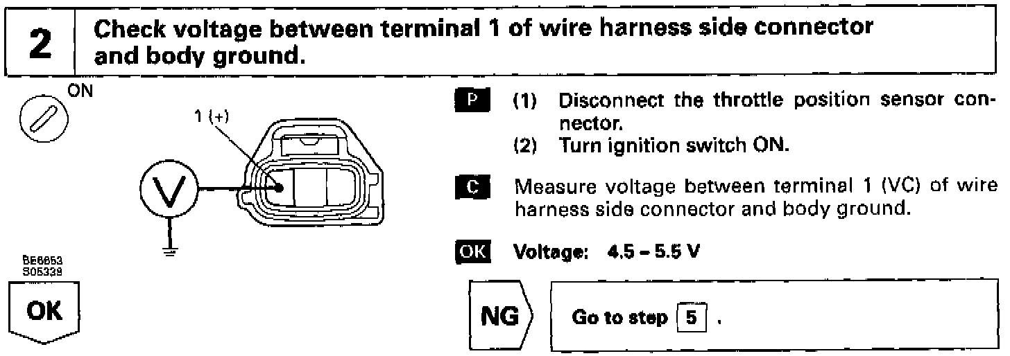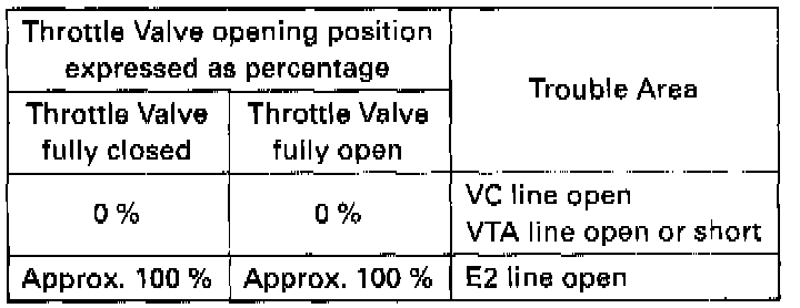 The throttle position sensor is mounted in the throttle body and detects the throttle valve opening angle. When the throttle valve is fully closed, a voltage of approximately 0.7 V is applied to terminal VTA of the ECM. The voltage applied to the terminal VTA of the ECM increases in proportion to the opening angle of the throttle valve and becomes approximately 2.7 5.2 V when the throttle valve is fully opened. the ECM judges the vehicle driving conditions from these signals input from terminals VTA and uses them as one of the conditions for deciding the air-fuel ratio correction, power increases correction and fuel-cut control etc.