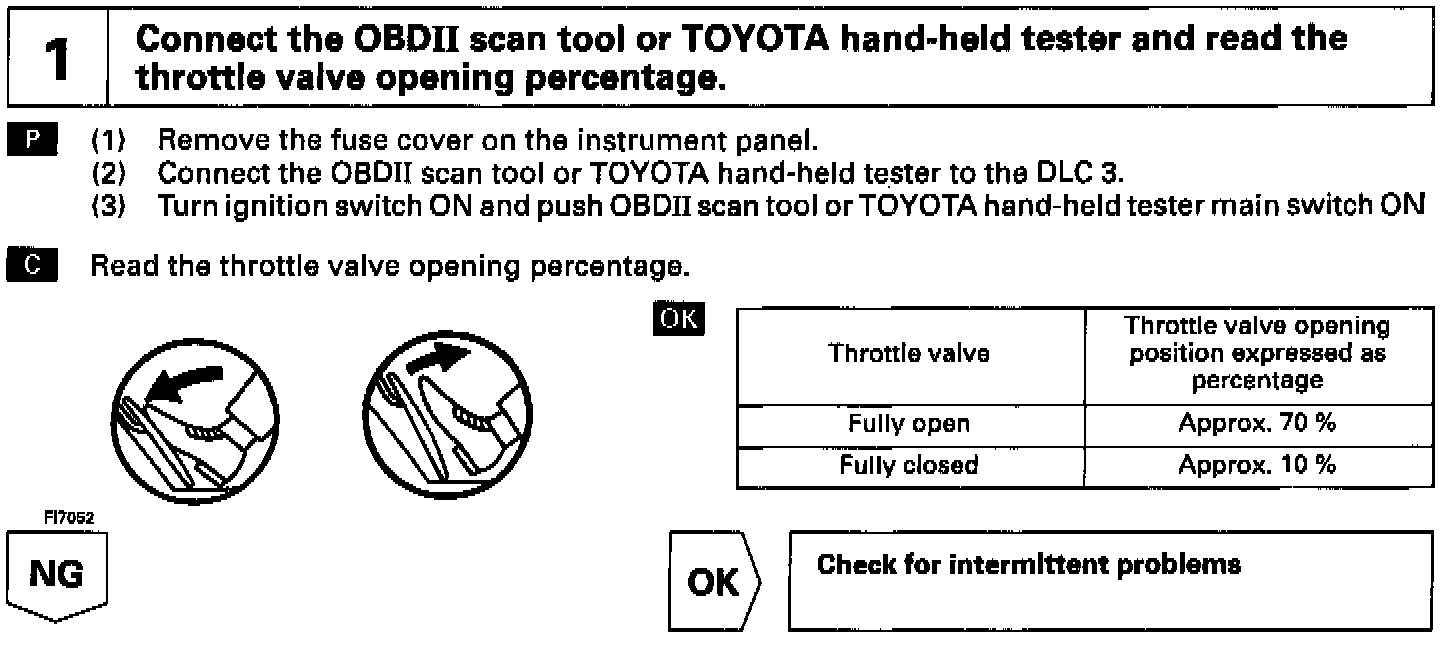 HINT: After confirming DTC P0120 use the OBDII scan tool or TOYOTA hand-held tester to confirm the throttle valve opening percentage and closed throttle position switch condition.