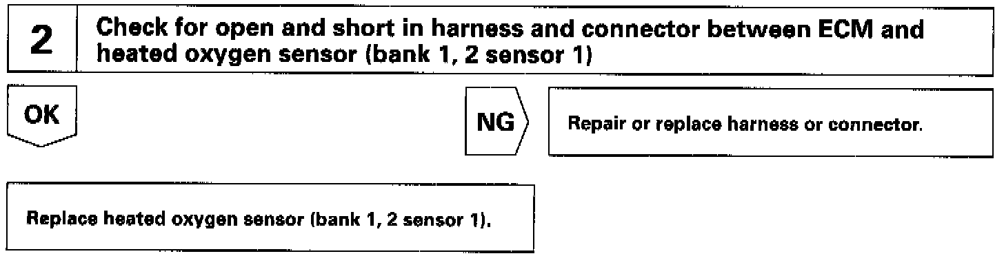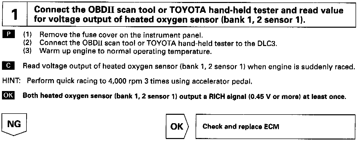 HINT: After confirming DTC PO125 use the OBDII scan tool or TOYOTA hand-held tester to confirm voltage output of heated oxygen sensor (bank 1, 2 sensor 1) from "CURRENT DATA". If voltage output of heated oxygen sensor (bank 1,2 sensor 1) is 0 V, heated oxygen sensor (bank 1,2 sensor 1) circuit may be open or short.