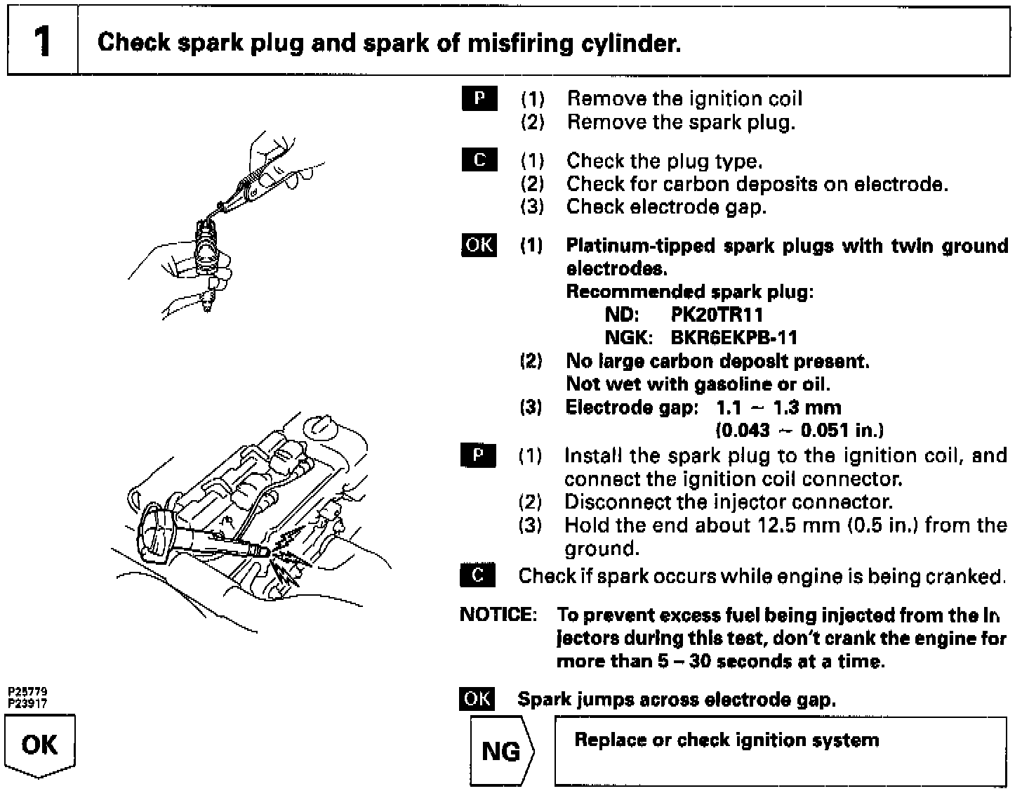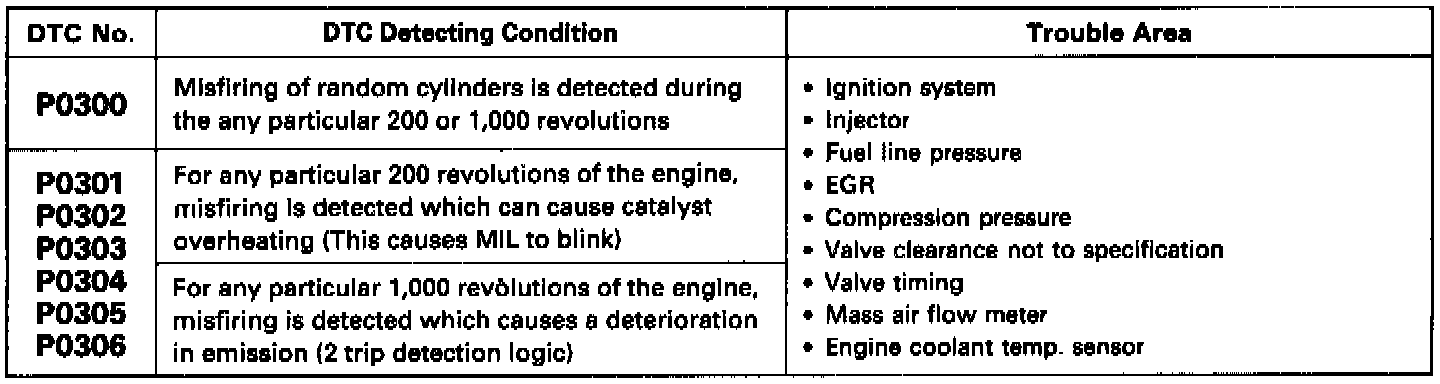HINT: When the 2 or more codes for a misfiring cylinder are recorded repeatedly but no Random Misfire code is recorded, it indicates that the misfires were detected and recorded at different times.