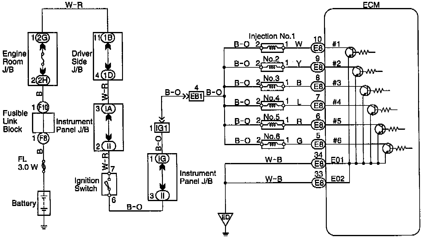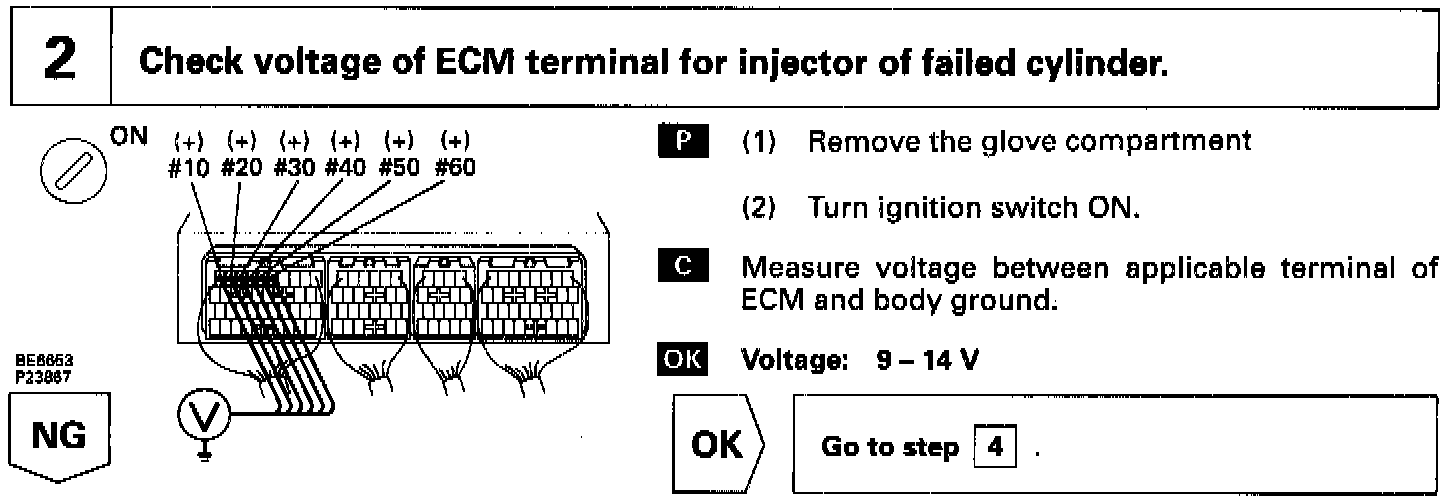 - With the engine idling, measure between terminals # 10 ~ # 60 and E01 of ECM.