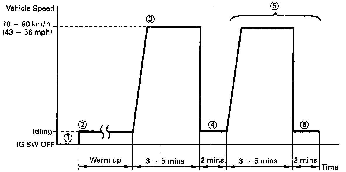 (3) Run the vehicle at 70 ~ 90 km/h (43 ~ 56 mph) for 3 minutes or more.