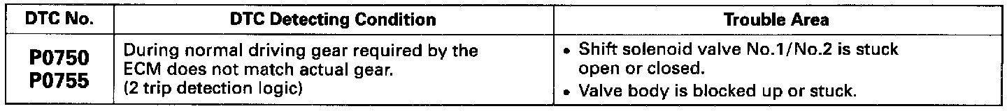 Check the shift solenoid valve No.1 when DTC P0750 is output and check shift solenoid valve No.2 when DTC P0755 is output.