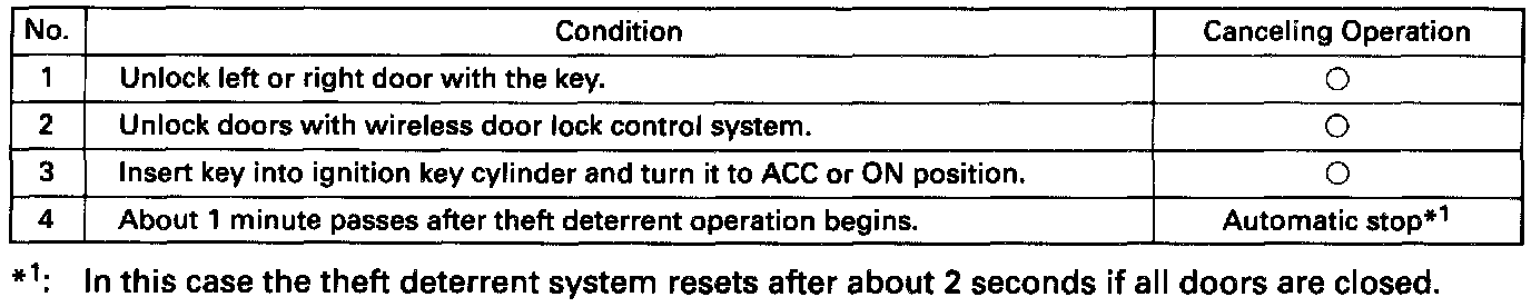 *1 = The theft deterrent systems is temporarily canceled only while the luggage compartment door is open. Approximately 2 seconds after the luggage compartment door is closed, the theft deterrent system is reset.