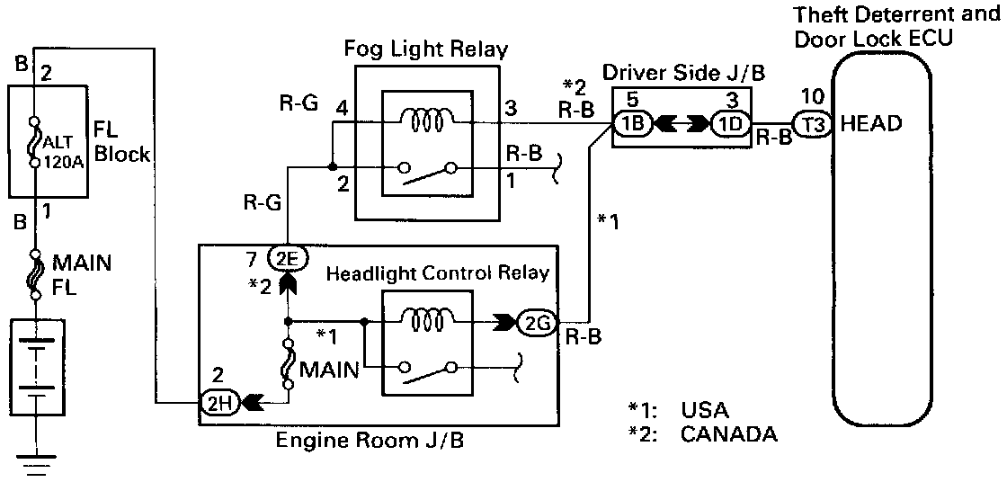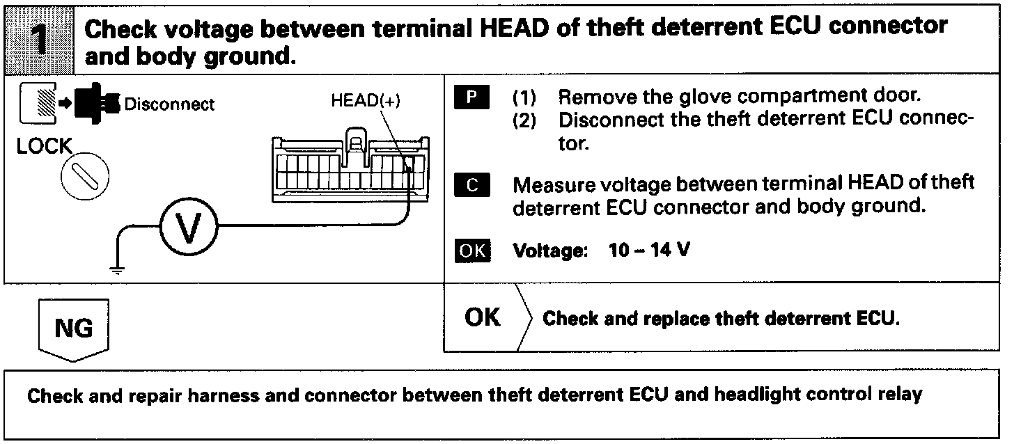 When the theft deterrent system is activated, it causes the Tr in the ECU to switch ON and OFF at approximately 0.4 sec. intervals. This switches the headlight control relay ON and OFF, thus flashing the headlights (See the wiring diagram).