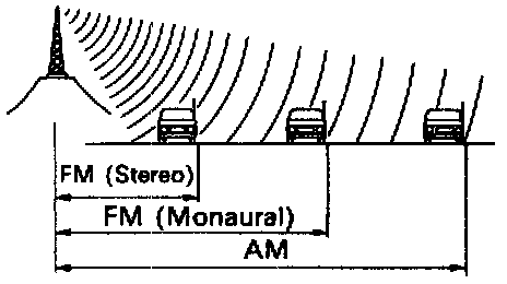 There are great differences in the size of the service area for AM, FM monaural, and FM stereo broadcasts cannot be received even though AM comes in very clearly.
