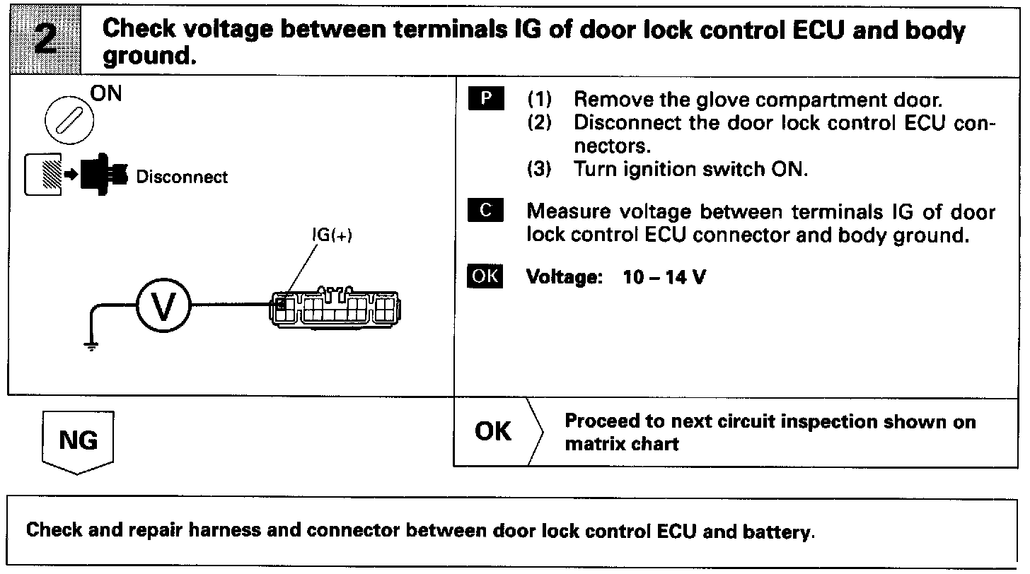 When the ignition switch is turned to the ACC position, battery positive voltage is applied to the terminal ACC of the ECU. When the battery positive voltage is applied to the terminal ACC of the ECU while the door lock control system is activated, the warning stops. Furthermore, power supplied from the terminals ACC of the ECU is used as power for the door courtesy switch, and position switch, etc.