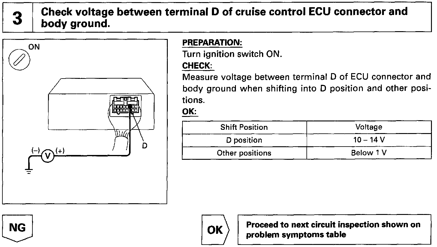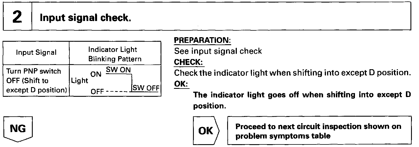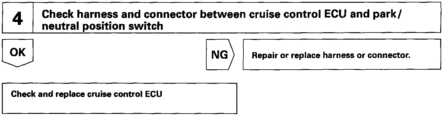 When the shift position is put in except D position, a signal is sent from the park/neutral position switch to the ECU. When this signal is input during cruise control driving, the ECU cancels the cruise control.