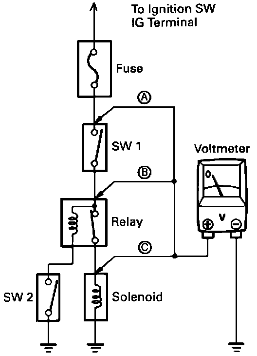 (b) Using a voltmeter, connect the negative lead to a good ground point or negative battery terminal, and the positive lead to the connector or component terminal. This check can be done with a test light instead of a voltmeter.