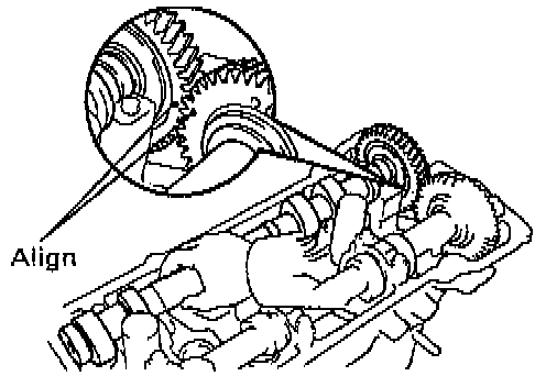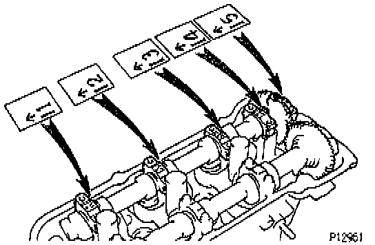 1. Install camshafts of LH cylinder head.CAUTION: Since the thrust clearance of the camshaft is small, the camshaft must be held level while it is being installed. If the camshaft is not level, the portion of the cylinder head receiving the shaft thrust may crack or be damaged, causing the camshaft to seize or break. To avoid this, the following steps should be carried out.