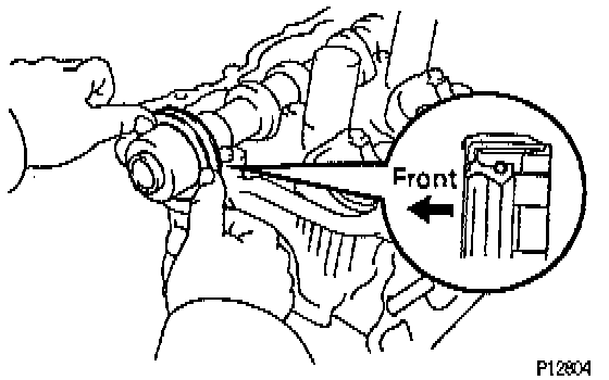 1. Install camshafts of RH cylinder head.CAUTION: Since the thrust clearance of the camshaft is small, the camshaft must be held level while it is being installed. If the camshaft is not level, the portion of the cylinder head receiving the shaft thrust may crack or be damaged, causing the camshaft to seize or break. To avoid this, the following steps should be carried out.