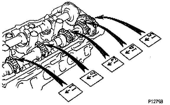 1. Install camshafts of RH cylinder head.CAUTION: Since the thrust clearance of the camshaft is small, the camshaft must be held level while it is being installed. If the camshaft is not level, the portion of the cylinder head receiving the shaft thrust may crack or be damaged, causing the camshaft to seize or break. To avoid this, the following steps should be carried out.