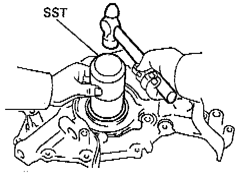 (b) Using Special Service Tool (SST) Cover and Seal Replacer # 09223 - 00010 or equivalent and a hammer, tap in a new oil seal until its surface is flush with the oil pump body edge.
