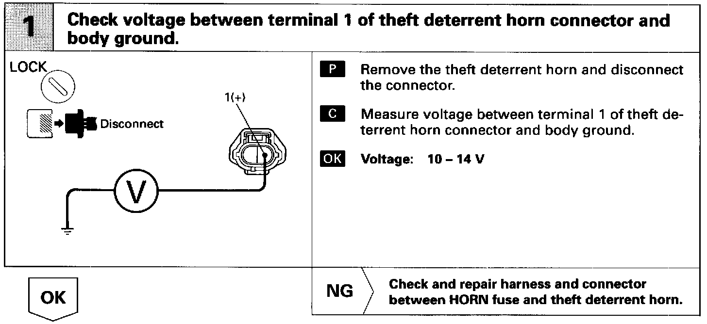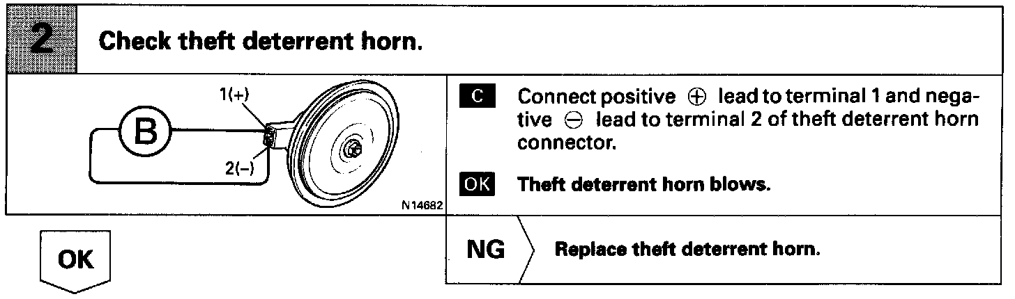 When the theft deterrent system is activated, contact (a) and contact (b) in the ECU close alternately in cycles of approximately 0.2 sec., causing the theft deterrent horn to blow (See the wiring diagram).