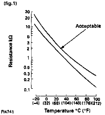 The intake air temp. sensor is built into the air flow meter and senses the intake air temperature. A thermistor built in the sensor changes the resistance value according to the intake air temperature. The lower the intake air temperature,the greater the thermistor resistance value, and the higher the intake air temperature, the lower the thermistor resistance value (See Fig. 1.).