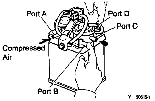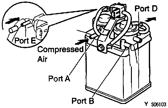(b) While holding port B closed, blow air (1.76 kPa, 18gf/sq.cm, 0.26 psi) into port A and check that air flows from port D.