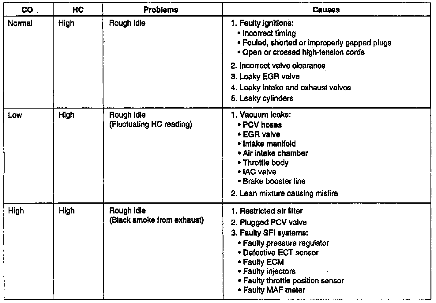 If the CO/HC concentration does not comply with regulations, troubleshoot according to the table. Check and correct the cause if necessary.