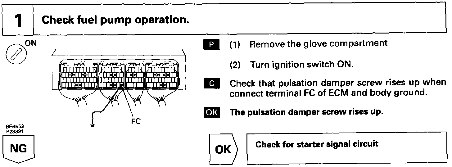 When the STA signal and NE signal are input to the ECM, Tr is turned ON, current flows to coil of the circuit opening relay, the relay switches on, power is supplied to the fuel pump and the fuel pump operates. While the NE signal is generated (engine running), the ECM keeps Tr ON (circuit opening relay ON) and the fuel pump also keeps operating.