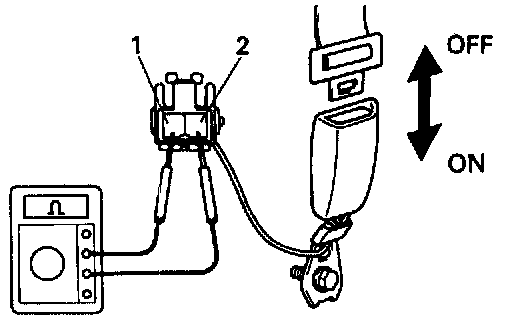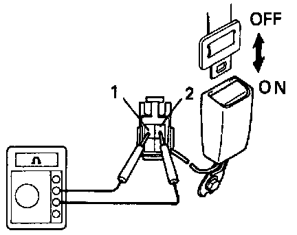 1. Check that there is continuity between terminals 1 and 2 on the switch side connector with the switch ON (belt fastened).
